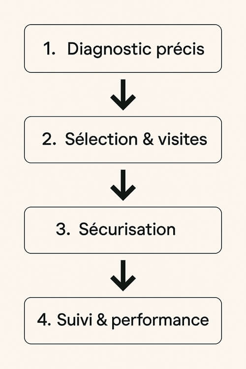 Short-list qualifiée, visites planifiées, dossier clair (photos, plans, charges).